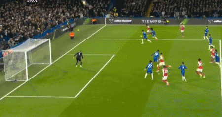 第45分钟,赖斯带球从容突破,禁区前沿倒三角回敲,马丁内利跟上打门,桑切斯飞身将球扑出,切尔西逃过一劫。
